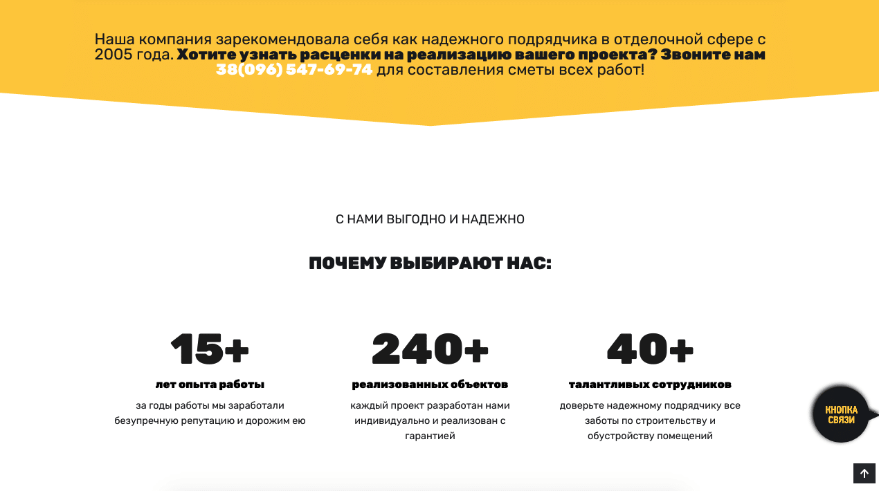Создание сайта услуг было завершено без единой правки со стороны Заказчика, он согласовал сайт на первой демонстрации. Еще одним достижением проекта считаем получение Заказчиком клиента на ремонт квартиры на первом дне после запуска рекламной кампании.
